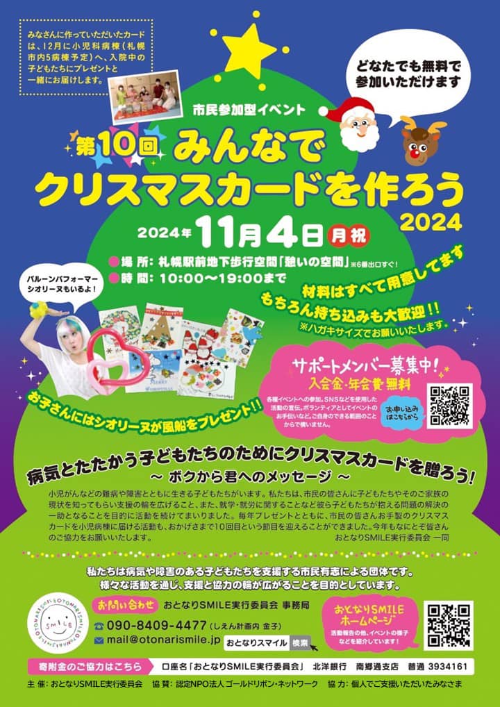| 2024年 | 市民参加型イベント『みんなでクリスマスカードを作ろう2024』 2024年11月4日(月)祝日 開催 場所:札幌駅前地下歩行空間「憩いの空間」(北1東) 時間:10:00~19:00まで ※みなさんに作っていただいたカードは、12月に小児科病棟(札幌市内5病棟予定)へ、入院中の子どもたちにプレゼントと一緒のお届けします。 詳しくはこちらをご覧ください。 |